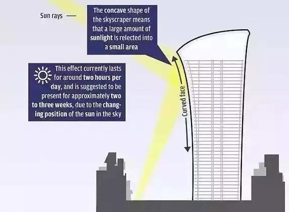 隨著日照的位置變化,大樓前面的廣場(chǎng)每天大約有 2 個(gè)小時(shí)要經(jīng)受「死亡之光」的燒烤,天氣晴朗時(shí)最高溫度能達(dá)到 70 攝氏度。