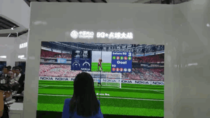 5G+點球大戰(zhàn),只需要站在指定區(qū)域,用力一踢,屏幕中的足球隨之飛出。