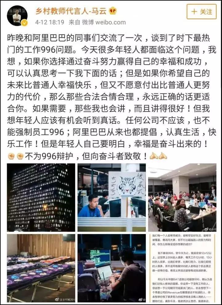 4月12日,阿里巴巴董事局主席馬云通過新浪微博再次做出解釋:“任何公司不應(yīng)該,也不能強制員工996;阿里巴巴從來也都提倡,認真生活,快樂工作!但是年輕人自己要明白,幸福是奮斗出來的!不為996辯護,但向奮斗者致敬!”