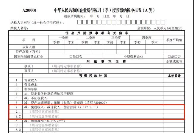 企業(yè)預繳享受研發(fā)費用加計扣除政策的,只需在《中華人民共和國企業(yè)所得稅月(季)度預繳納稅申報表(A類)》(A200000)第7行“減:免稅收入、減計收入、加計扣除”項下的明細行次填報有關事項及加計扣除金額即可。