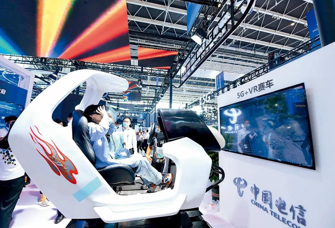 2021年9月8日,參觀者在2021中國國際數(shù)字經(jīng)濟(jì)博覽會現(xiàn)場體驗(yàn)5G+VR賽車 陳其保攝