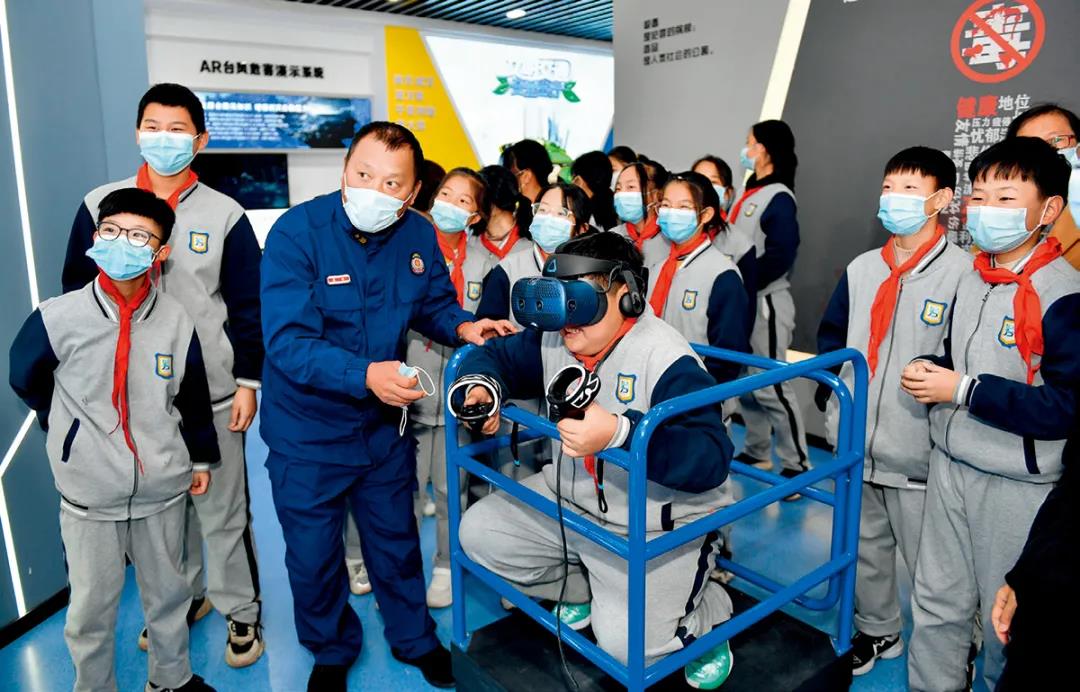 2021年11月9日,浙江湖州吳興區(qū)埭溪鎮(zhèn)上強(qiáng)中學(xué)的學(xué)生在消防救援站的綜合安全教育館內(nèi)體驗(yàn)VR 地震逃生 黃宗治攝
