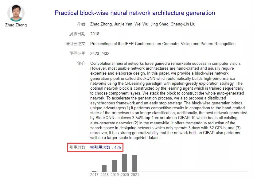 鐘釗在這篇論文中提出一種自動構(gòu)建高性能神經(jīng)網(wǎng)絡(luò)的分塊生成辦法,現(xiàn)在已被引用 400 余次。這也是鐘釗在 AutoML 這一相對新興的方向發(fā)表的第一篇論文。后來,他的研究方向逐漸聚焦于此,博士畢業(yè)論文也以《深度神經(jīng)網(wǎng)絡(luò)結(jié)構(gòu):從人工設(shè)計到自動學習》為題。