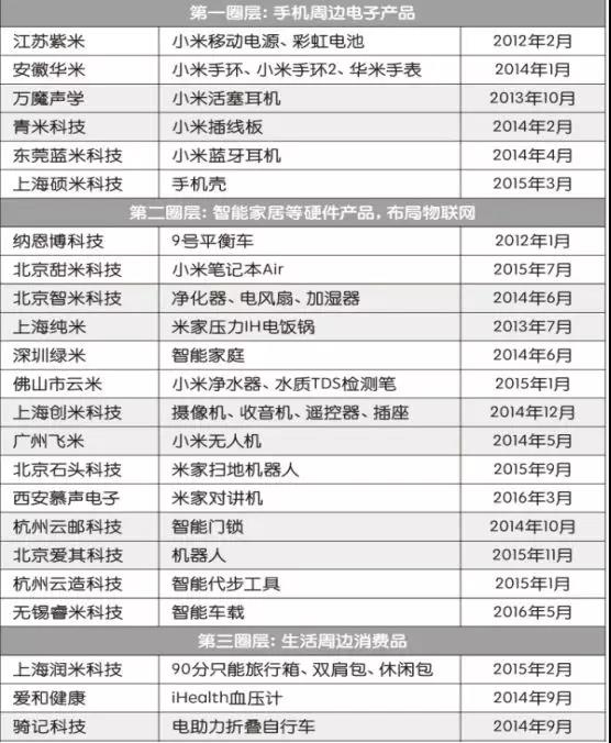 第二圈層是智能硬件,小米投資孵化了多個(gè)領(lǐng)域的智能硬件產(chǎn)品,如空氣凈化器、凈水器、電飯煲等傳統(tǒng)白電的智能化;也投資孵化了無(wú)人機(jī)、平衡車(chē)、機(jī)器人等極客互融類(lèi)智能玩具。2014?2016年的三年,小米先后投資了27/28/22個(gè)智能硬件生產(chǎn)企業(yè),相當(dāng)于15天就投資一家,為其物聯(lián)網(wǎng)布局完善智能硬件產(chǎn)品系列。