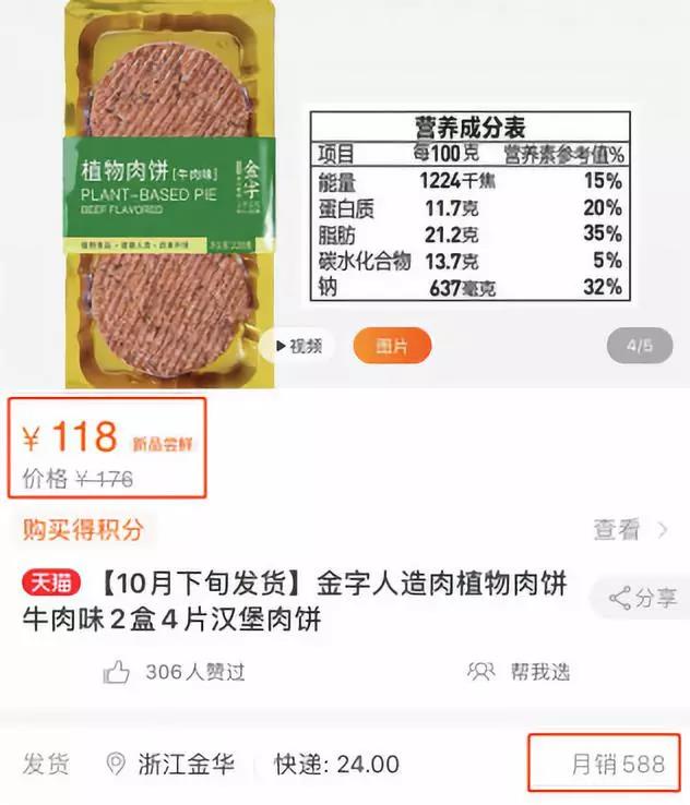 目前,金字火腿生產(chǎn)的人造肉產(chǎn)品目前已在其天貓旗艦店預(yù)售,并顯示將于10月下旬發(fā)貨。產(chǎn)品介紹欄顯示,上述人造肉餅以大豆等植物蛋白制成,有牛肉質(zhì)感和口感,被定位為健身達人、素食主義、養(yǎng)生人群的輕食好伴侶。
