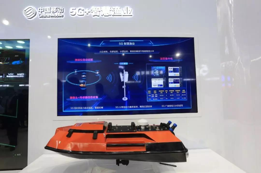 在5G+智慧漁業(yè)展示的5G無人船,5G的超低時延讓它可以做到自動巡航、智能投喂,超大帶寬可以實現(xiàn)魚群監(jiān)控,超大連接可以實現(xiàn)水質(zhì)監(jiān)控。