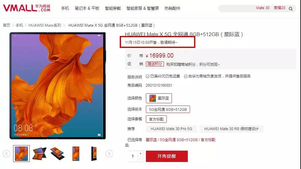據(jù)華為官方商城信息顯示,華為 Mate X 5G 折疊屏手機(jī)將于今日上午 10 點(diǎn) 08 分開(kāi)始,在華為商城限量銷售。8GB 內(nèi)存+512GB 存儲(chǔ)空間價(jià)格為 16999 元。華為 Mate X 采用柔性折疊屏,使用鷹翼式外折方案,展開(kāi)時(shí)可達(dá) 8 英寸;輕輕翻折,又能成為可單手掌控的 6.6 英寸屏幕,另一塊屏幕尺寸則為 6.38 寸,機(jī)身單邊厚度僅為 5.4 mm。