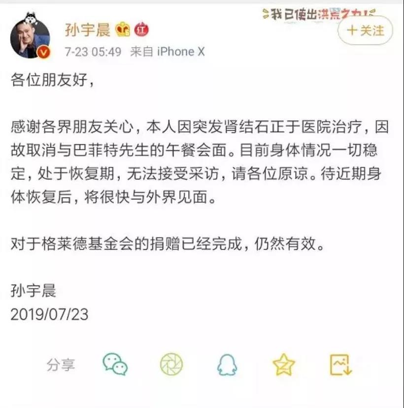 2019年6月4日,陪我APP董事長(zhǎng)兼CEO孫宇晨宣布:以破紀(jì)錄4567,888美元成功拍下沃倫巴菲特20周年慈善午宴。7月23日,孫宇晨表示,本人因突發(fā)腎結(jié)石正于醫(yī)院治療,因故取消與巴菲特先生的午餐會(huì)面。孫宇晨表示,自己一直是巴菲特價(jià)值投資理念的長(zhǎng)期信仰者,同時(shí)他也將邀請(qǐng)多位區(qū)塊鏈行業(yè)人士共同赴宴。
