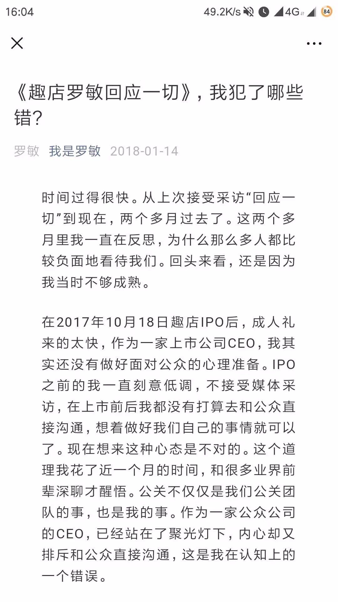 2018年1月14日,一個叫“我是羅敏”的公眾號更了一篇文章——《趣店羅敏回應(yīng)一切,我犯了哪些錯?》,羅敏通過這個公眾號講述了自己“突然醒悟”的故事。兩天后,羅敏接受媒體采訪。羅敏在媒體見面會上說:“我終于意識到,過去是我錯了,是我做的不成熟,我需要改變”,“我用兩個多月時間,把這個問題解決了”