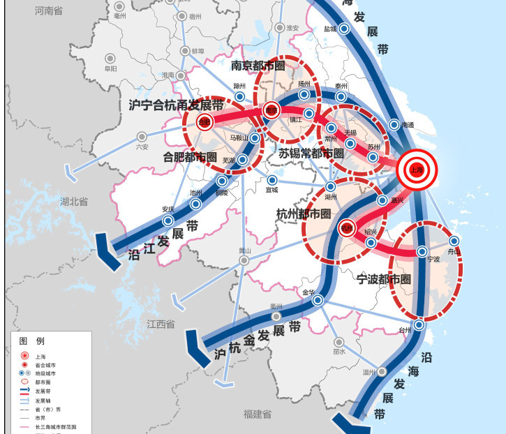 長三角共劃分為六大都市圈:上海大都市圈、杭州都市圈、蘇錫常都市圈、南京都市圈、合肥都市圈、寧波都市圈。