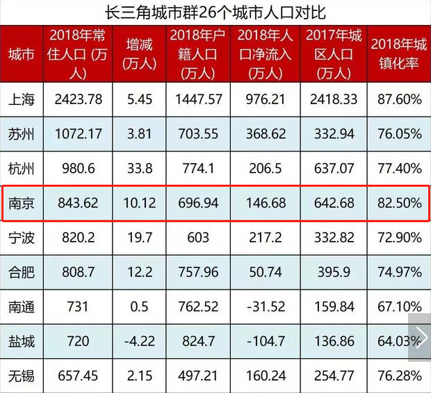 雖然蘇州和杭州的常住人口均多于南京,但是南京的城鎮(zhèn)化率較高!據(jù)統(tǒng)計,2018年年末,長三角平均城鎮(zhèn)化率為67.38%,而超過80%只有上海和南京!