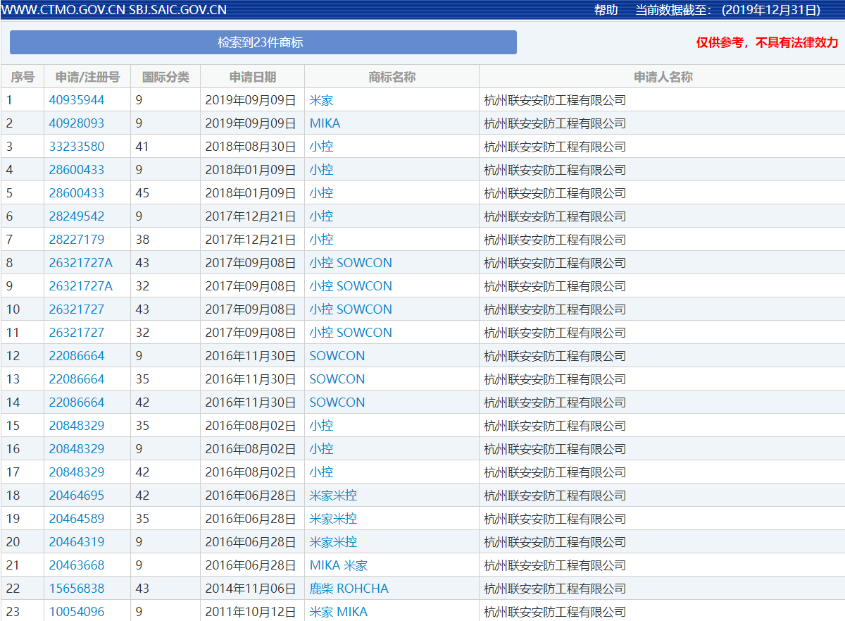而聯(lián)安安防成立于2003年,法人趙軍,注冊資本1000萬,實繳則只有100萬,旗下?lián)碛小癕IKA米家”、“小控”、“SOWCON”等商標(biāo)品牌的智能產(chǎn)品,主做安防工程、弱電工程。