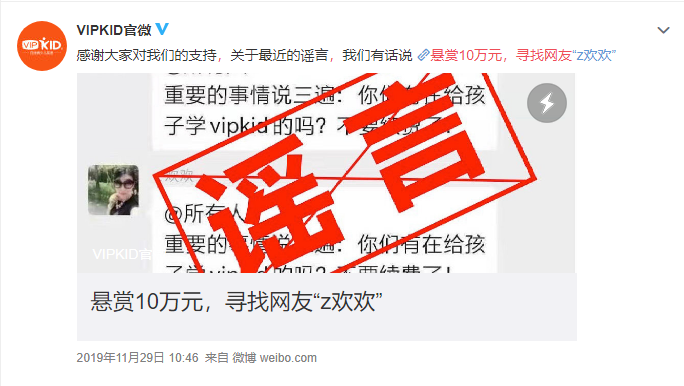 11月底,VIPKID官微發(fā)布“懸賞10萬元,尋找網(wǎng)友‘Z歡歡’”的信息,稱此網(wǎng)友在家長微信群發(fā)布VIPKID要破產(chǎn)的謠言。