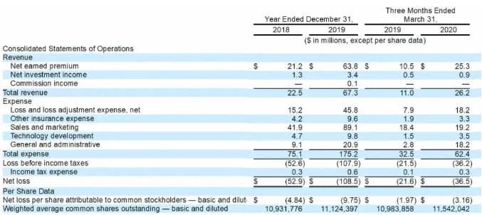 Lemonade在2018年、2019年凈虧損分別為5290萬美元、1.085億美元;Lemonade在2020年第一季度凈虧損為3650萬美元,上年同期凈虧損為2160萬美元。
