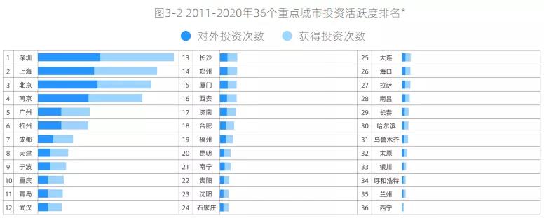 城市投資活躍度,是以該城市參與的投資事件(對外投資次數+獲得投資次數)總和來排序。