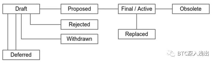 簡單來說,BIP的流程包括草案(Draft)、建議(Proposed)、實現(xiàn)(Final/Active)、廢棄(Obsolete)。這里有一個BIP,就是專門講如何處理BIP的。