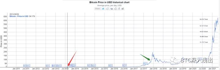 這樣說,還是有點抽象,我們來看下面這張比特幣價格圖。下圖,紅色箭頭所指是“麗姐”的交易時間,綠色箭頭所指是徐林大媽的交易時間。然后你再比較一下,那兩個點與現(xiàn)在價格的差距,感覺是不是更具體了呢?