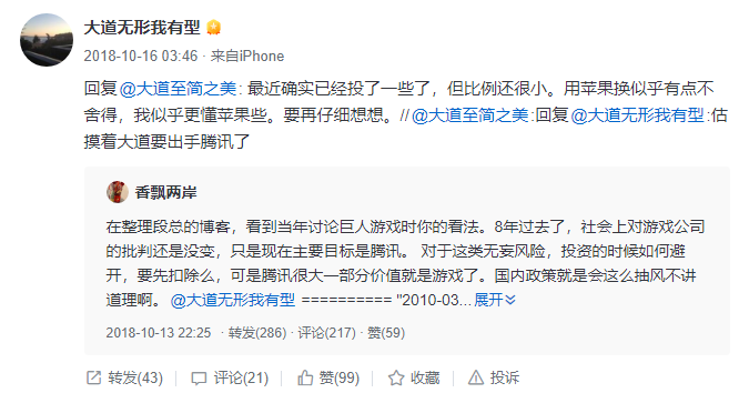 事實上,這已經(jīng)不是段永平第一次抄底騰訊。根據(jù)他在雪球上的分享,2018年游戲行業(yè)處于低谷時段永平就曾抄底騰訊。騰訊也是除蘋果、茅臺外,段永平在二級市場關(guān)注最多的個股之一。