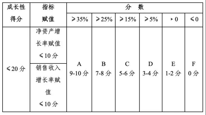 以上兩個(gè)指標(biāo)分別對(duì)照下表評(píng)價(jià)檔次(ABCDEF)得出分值,兩項(xiàng)得分相加計(jì)算出企業(yè)成長(zhǎng)性指標(biāo)綜合得分。