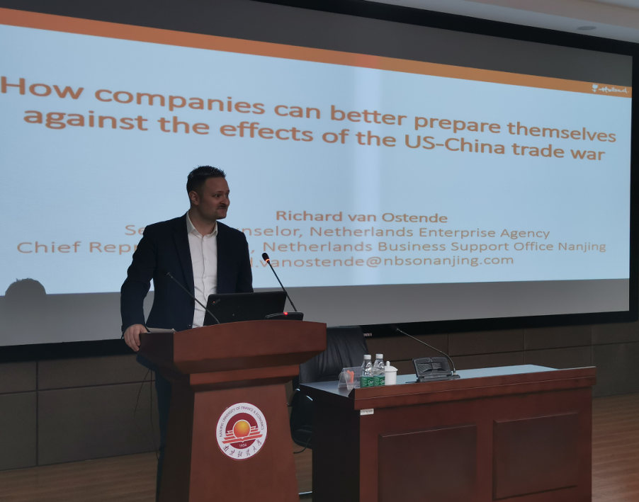 荷蘭貿易促進委員會南京代表處首席代表、BSN荷蘭商學院校友Richard先生也對中美之競提出了自己的見解,表示中國是個地大物博的國家,各個國家都能感受到中國經(jīng)濟的飛速發(fā)展。中國與美國之間的問題絕不僅僅是兩個國家的事情,世界各個國家也都在關注著這一事件的發(fā)展。并就“中歐合作與創(chuàng)新發(fā)展”這一主題進行演講。
