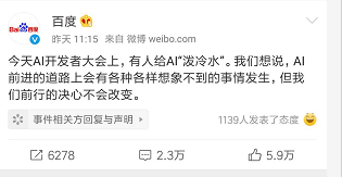 7月3日晚,百度在社交網(wǎng)站上發(fā)布潑水事件發(fā)表正式回應(yīng)“針對今天在AI開發(fā)者大會現(xiàn)場的時間,我們感到憤怒,并強(qiáng)烈譴責(zé)肇事者的行為!”“AI前進(jìn)的道路上有著各種各樣意想不到的事情發(fā)生,但我們前行的決心不會改變。”