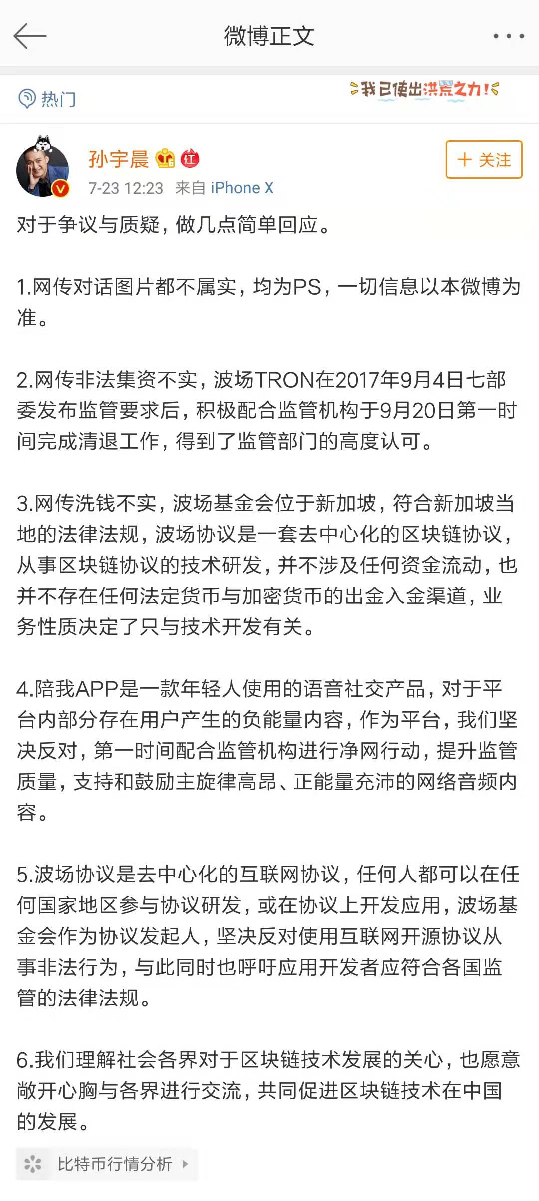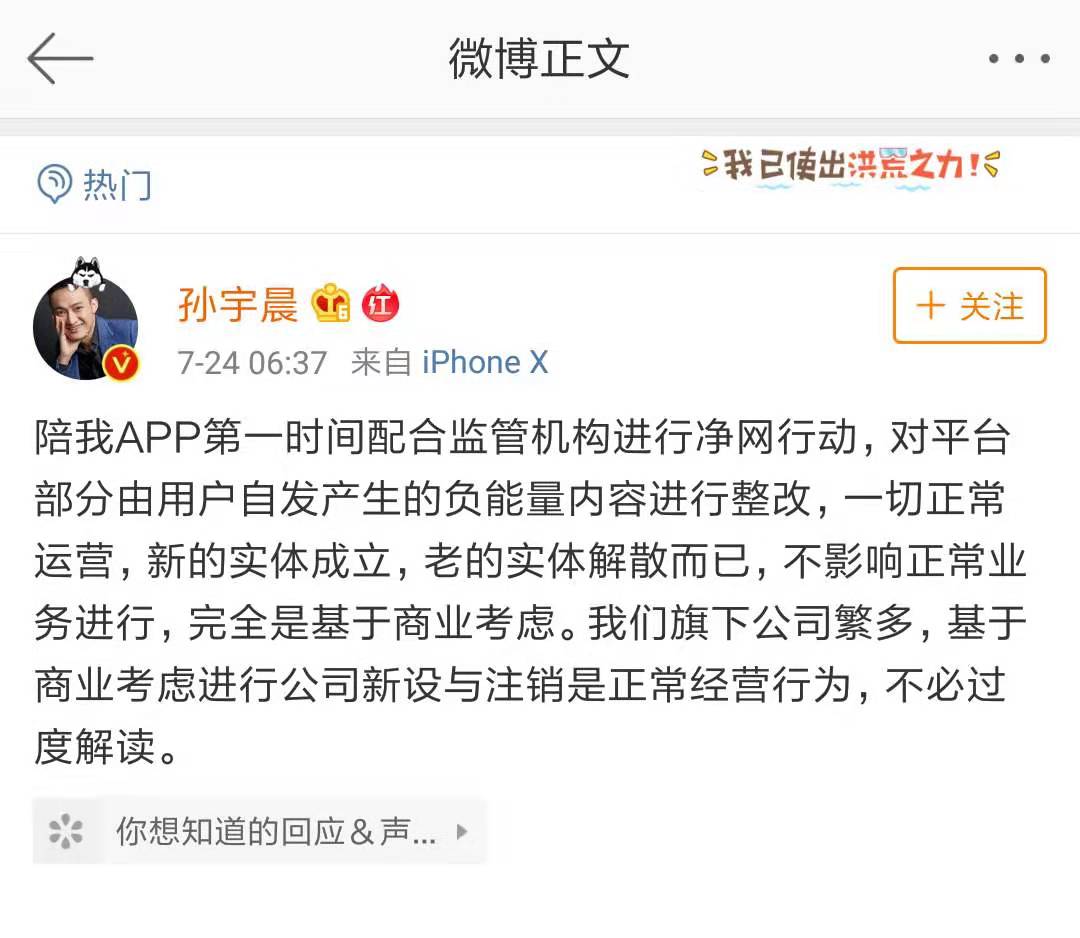 今日,針對(duì)網(wǎng)友關(guān)注的孫宇晨旗下陪我APP運(yùn)營(yíng)主體決議解散,孫宇晨發(fā)表微博回復(fù)“陪我APP第一時(shí)間配合監(jiān)管機(jī)構(gòu)進(jìn)行凈網(wǎng)行動(dòng)”、“基于商業(yè)考慮進(jìn)行公司新設(shè)與注銷是正常經(jīng)營(yíng)行為,不必過度解讀”。